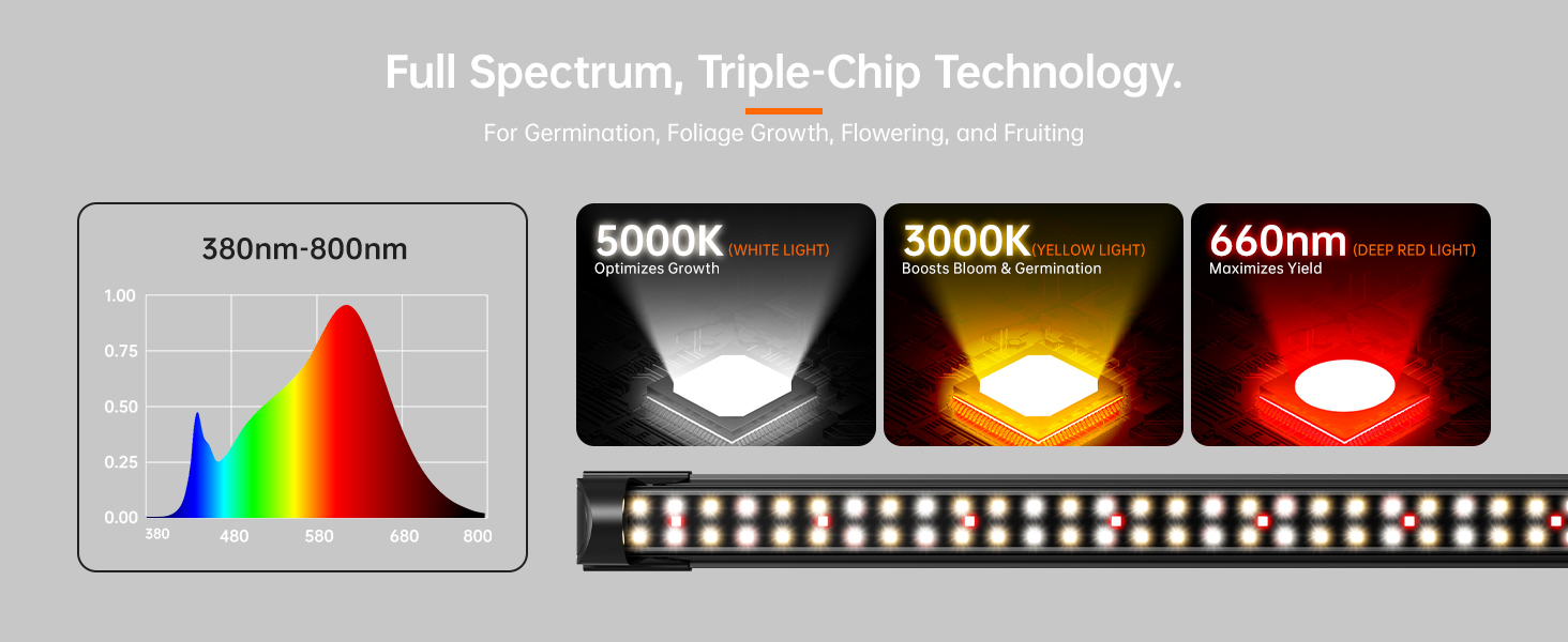 Four 24W full-spectrum LED bars deliver 287.6 μmol/㎡/s PPFD at 4 inches. Enhanced 660nm red spectrum boosts photosynthesis for lush foliage growth and healthy seedling development.
