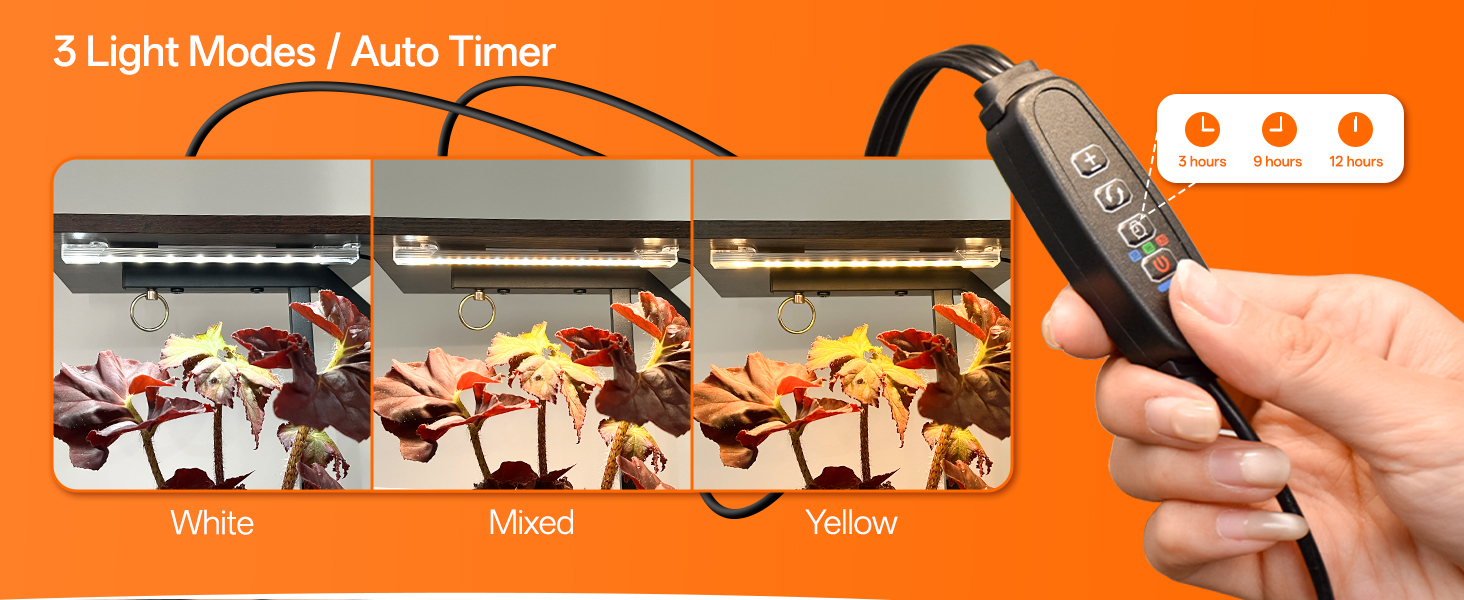 Nurture your plants with our advanced three-head grow light bar featuring three specialized spectral modes (yellow/mixed/white) and ten precise dimming settings. The programmable timer offers 3/9/12-hour cycle options, automatically maintaining optimal lighting conditions for healthy plant growth. This smart system eliminates guesswork while providing consistent, professional-grade illumination for all your plants' needs.