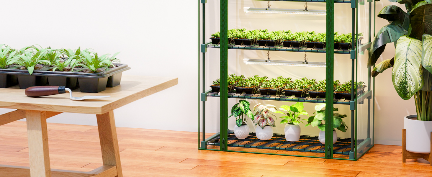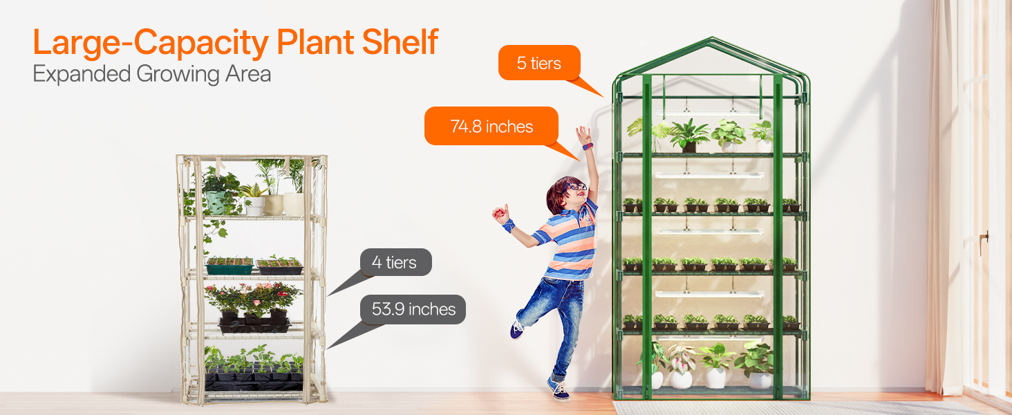 Maximize your cultivation potential with our impressive 74.8-inch tall greenhouse featuring five generously spaced tiers that measure 40.2"L x 18.9"W. Each level accommodates multiple growing configurations simultaneously, holding both 32-cell propagation trays and 12-cell starter trays to create the ultimate versatile growing environment. This intelligent design supports everything from delicate seedling nurturing to organizing mature succulents and flowering plants.