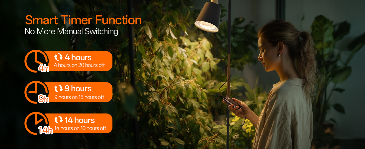 Enjoy worry-free plant parenting with the intelligent timer function that automatically maintains perfect light cycles. Choose from 4, 9, or 14-hour settings to match your plants' specific needs, and the light will consistently operate on your chosen schedule. This smart feature eliminates the need for daily manual operation, ensuring your plants receive consistent care even when you're away from home or busy with other activities.
