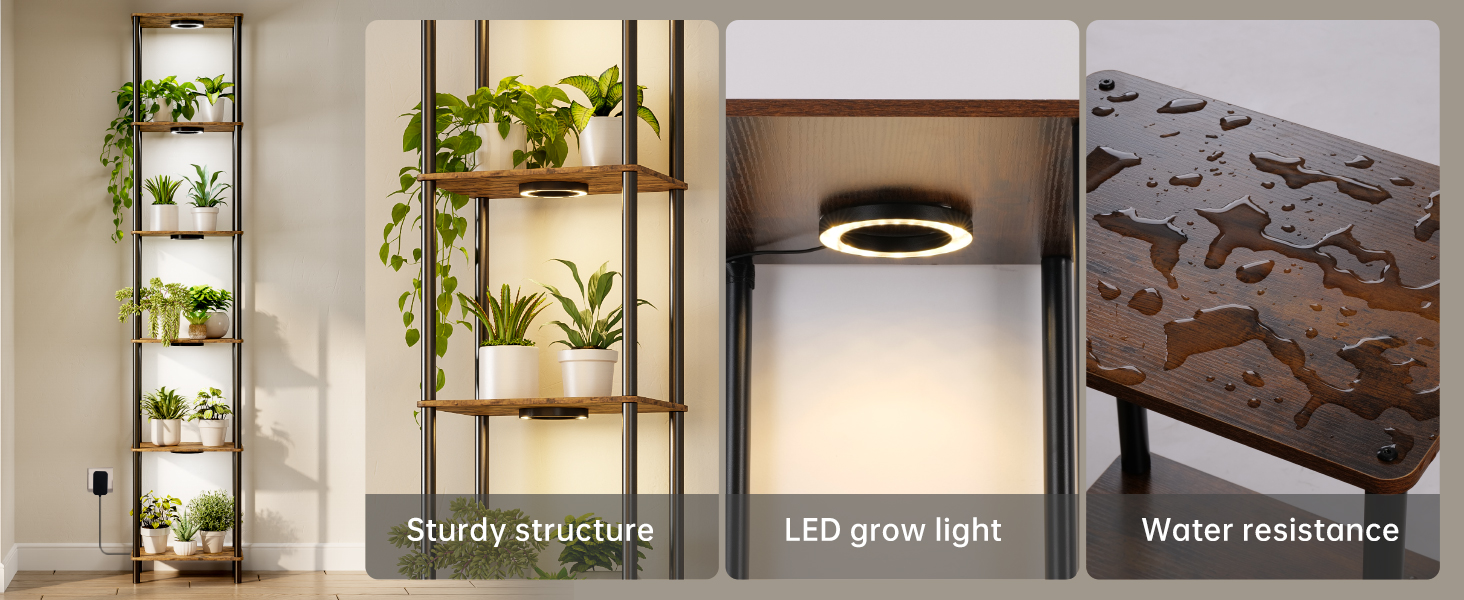 Built with robust 0.62-inch heavy-duty iron pipes featuring rust-resistant coating, this plant stand ensures exceptional stability and longevity. The 0.47-inch thick MDF boards with waterproof coating provide strong support while resisting warping, curling, and wear. This premium construction guarantees reliable performance year after year, safely supporting your plant collection while maintaining its attractive appearance.